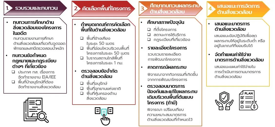 งานศึกษาความเป็นไปได้และผลกระทบด้านสิ่งแวดล้อม จะดำเนินการศึกษาสภาพพื้นที่ปัจจุบัน ความเป็นไปได้ของที่ตั้ง ข้อจำกัดด้านสิ่งแวดล้อม รวมไปถึงผลกระทบจากการพัฒนาโครงการงานศึกษาและวิเคราะห์ความเหมาะสมแนวทางการให้เอกชนพัฒนาและบริหารจัดการจุดจอดพักรถ และสถานีตรวจสอบน้ำหนัก