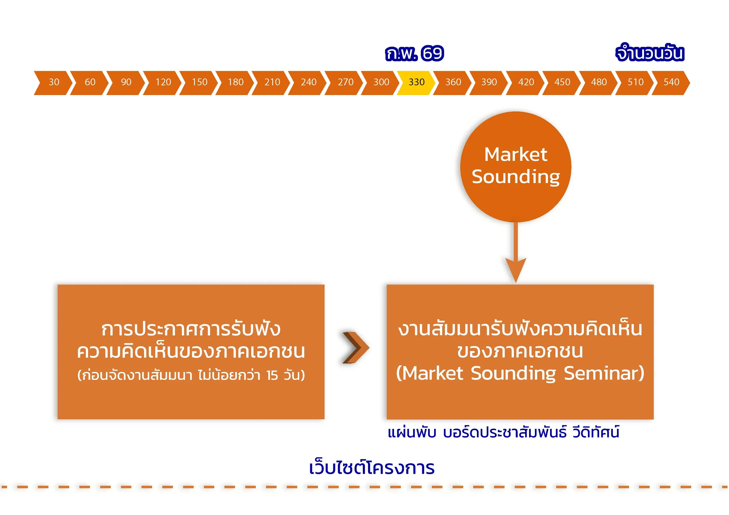จัดให้มีการรับฟังความคิดเห็นของภาคเอกชน (Market Sounding) โดยจะดำเนินการให้เป็นไปตามประกาศคณะกรรมการนโยบายร่วมลงทุนระหว่างรัฐและเอกชน เรื่อง หลักเกณฑ์และวิธีการรับฟังความคิดเห็นของภาคเอกชน พ.ศ. 2563 ตามมาตรา 33 แห่งพระราชบัญญัติการร่วมลงทุนระหว่างรัฐและเอกชน พ.ศ. 2562 การรับฟังความคิดเห็นของภาคเอกชน (Market Sounding) ประกอบด้วย ผู้แทนของภาคเอกชนผู้สนใจร่วมลงทุนในการพัฒนาและบริหารจัดการโครงการ สถาบันทางการเงิน หน่วยงาน และผู้มีส่วนเกี่ยวข้อง เพื่อรับฟังความคิดเห็นและข้อเสนอแนะ นำมาใช้ประกอบการศึกษาโครงการ ในทุกส่วนที่เกี่ยวข้องให้มีความเหมาะสมและเป็นไปได้ในทางปฏิบัติ
